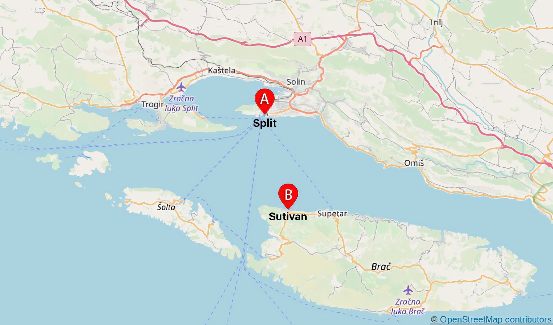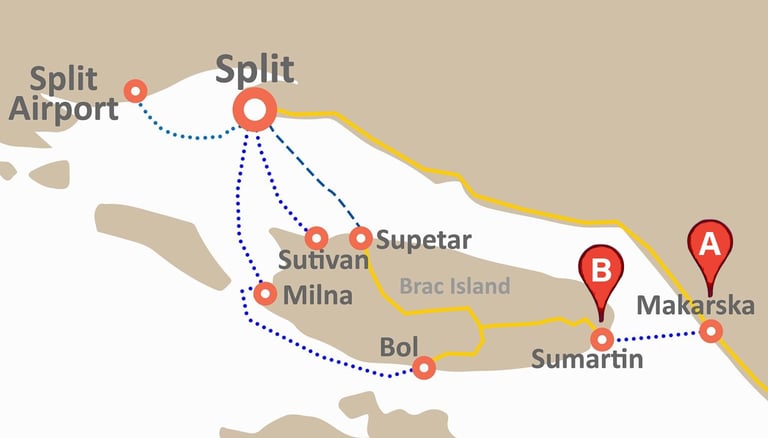 Makarska to Sumartin: A car ferry connects the mainland (A) Makarska Riviera to the east side of the island (B) Sumartin.